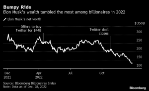 Зашеметяващите близо 1,4 трилиона долара бяха изтрити от състоянията на 500-те най-богати личности, показва индексът на милиардерите на Bloomberg. Голяма част от болката беше предизвикана от самите тях: предполагаемите измами на някогашното чудо на криптосвета Сам Банкман-Фрийд; опустошителната война, водена от Русия срещу Украйна, която доведе до осакатяващи санкции срещу руските титани в бизнес средите; и – разбира се – егоцентризмът на Илон Мъск – новият собственик на Twitter, която струва 138 милиарда долара по-малко спрямо 1 януари.