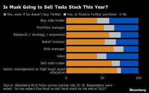 Около 75% от 1562 респонденти в анкетата, в това число портфолио мениджъри и индивидуални инвеститори, смятат, че Мъск няма да стане собственик на Twitter Inc. – сделка, която го накара да разпродаде през април акции на Tesla в размер на около 8,5 млрд. долара. Една трета от респондентите прогнозират, че предприемачът ще се сключи извънсъдебно споразумение със социалната платформа срещу 1 млрд. долара, вместо да я придобие в сделка за 44 млрд. долара при 54,20 долара на акция. Около 27% от анкетираните смятат, че Мъск ще бъде осъден да плати 1 млрд. долара глоба заради разпадането на сделката с Twitter.