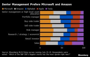 Все пак респондентите не изглеждат особено уверени в ценови ръст при книжата на Tesla в скоро време в сравнение с други големи компоненти в рамките на S&P 500. Около една четвърт от анкетираните смятат, че Microsoft Corp. предлага най-голям потенциал за поскъпване, като приблизително същия брой респонденти залагат на Amazon.com Inc. Около 21% очакват ръст при Alphabet Inc., докато 18% посочват Apple Inc. Tesla е на последно място с 12,5% от анкетираните.