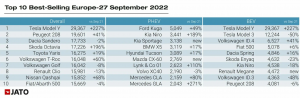 След период на бавен растеж, търсенето на електрически автомобили се е увеличило значително през септември със 160 869 регистрирани бройки. Обемът се е увеличил с 15%, което представлява 15,6% от общия брой регистрации – вторият най-голям месечен пазарен дял след декември 2021 г.